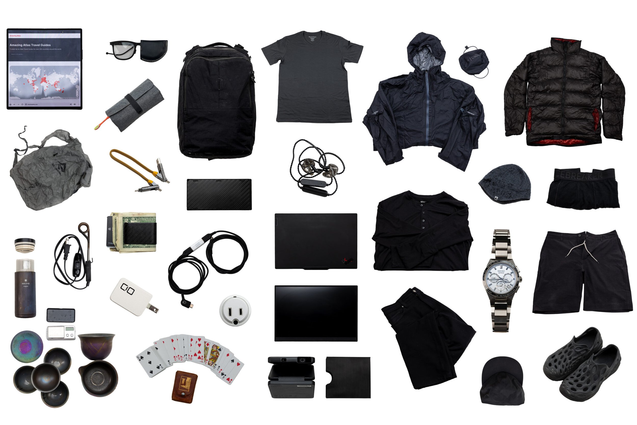 Clothes for one-bag travel should be treated as a system. Every item of clothing, including pants, shirts, midlayers, jackets, hats, and shoes, should be able to be worn with any other items and complement each other. The fastest way to get there is to choose a small number of colors and stay disciplined. If you choose too many colors, they won't work well together. If you choose too few, it will feel monochromatic.